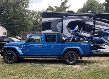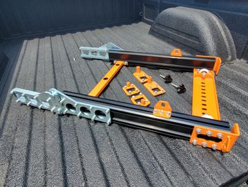 Ingenious mounting system which requires no drilling in the cargo bed, using either ratchet straps or turnbuckles (not supplied) to secure the ramp to the vehicle. The kit includes heavy polyurethane pads mounted under the ramp to keep it off painted surfaces. This is the only ramp on the market that can be mounted without bolts and does not prevent from pulling a trailer/camper!