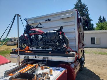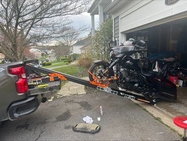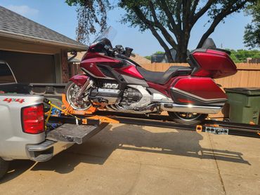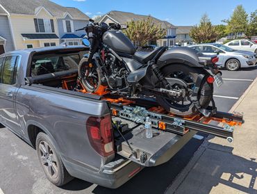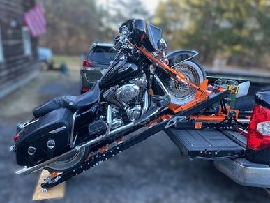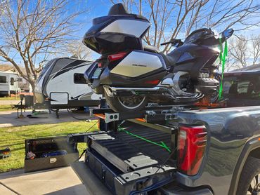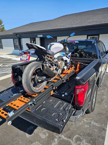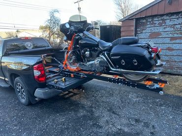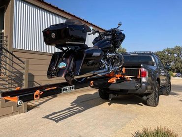 The next generation in motorcycle ramps, introducing the AUN250 folding ramp for short bed trucks. All the lifting capabilities of the AUN210, using the same accessory line, but the AUN250 can fit inside the closed tailgate of most short bed trucks (after unloading the bike).
